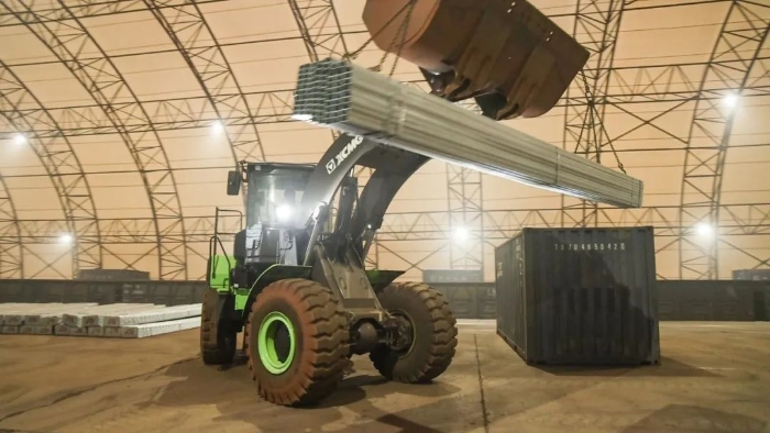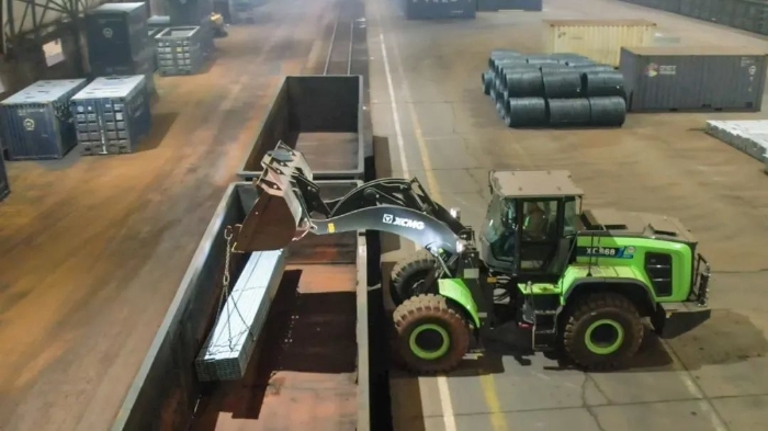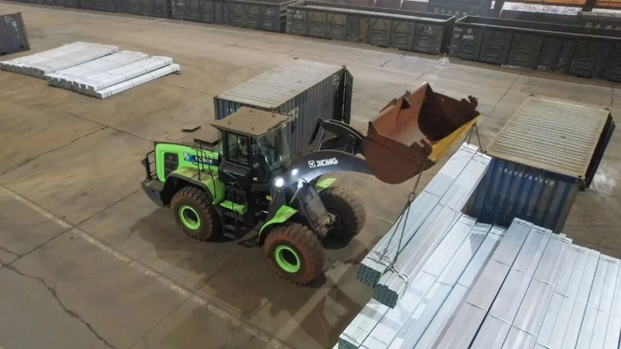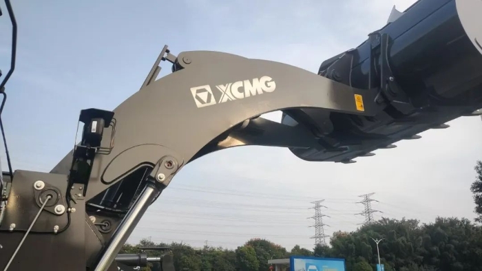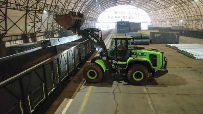 货运站台上,一台绿甲战士——徐工XC968-EV纯电动装载机有着不同以往的圆弧型大臂,像极了武侠小说中的“圆月弯刀”,格外引人注目。