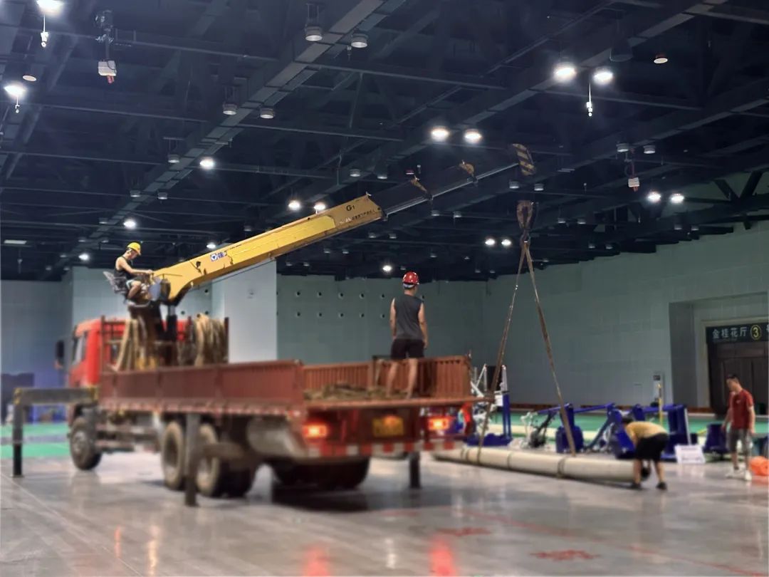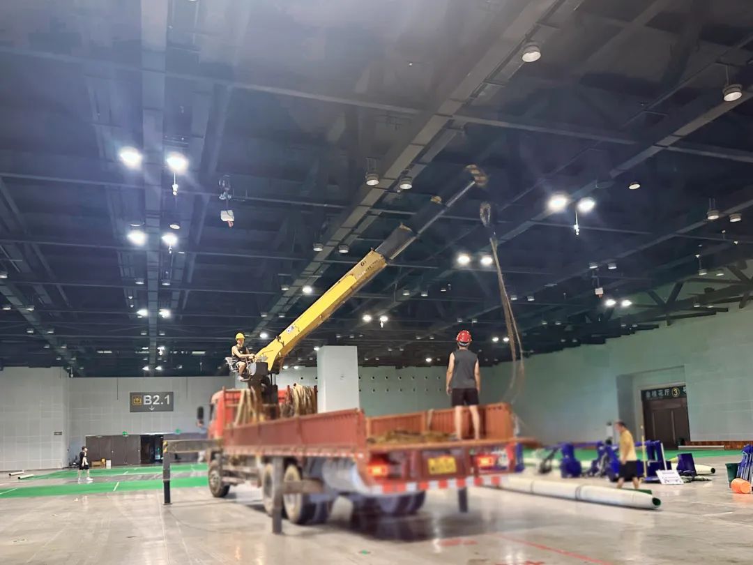 施工中,徐工随车起重机凭借高强度钢材打造的起重臂,展现出惊人的起重能力。吊运成卷塑胶卷材时,它动作流畅,如行云流水般将材料从货箱卸下,稳稳送至场馆指定铺设位置。面对数吨重的特殊塑胶材料吊运难题,其四节臂体同步伸缩,轻松完成任务。“这设备的带载能力远超预期,再重、再难的吊运都不在话下!” 现场项目负责人对徐工随车起重机的强大性能给予高度评价。