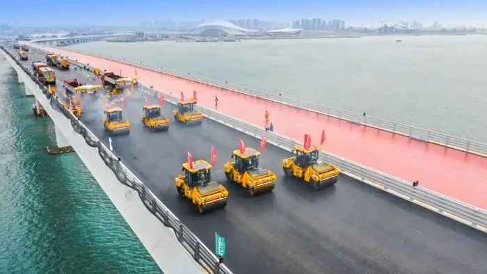翔安大桥在建设中既要克服海上风浪大、潮差高、岩层强度高、跨越生态保护区等困难,又要兼顾绿色环保;要在这种复杂的环境中保证施工质量,对设备和施工技术的选择就显得尤为重要。徐工数字化智能施工集群凭借其智能化、高精度、高效率等显著优势,成功克服了传统施工方式难以应对的诸多难题,可精准适配翔安大桥的桥面铺装工作。