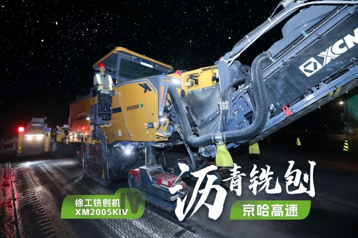 此次施工项目为京哈高速的路面改扩建工程,铣刨深度5cm,铣刨速度25m/min。由于北京地区日间车流量大,交通压力较大,因此施工方选择在夜间施工,日间恢复行车,尽量避免施工给交通带来影响。由于夜间施工更加考验施工设备的稳定性、施工质量的可靠性,施工方选择了两台徐工两米铣刨机作为本次高速公路养护工程的铣刨设备,分别为XM2005KIV和XM200KII,同时进行铣刨作业,并肩作战,按下施工进度快进键。
