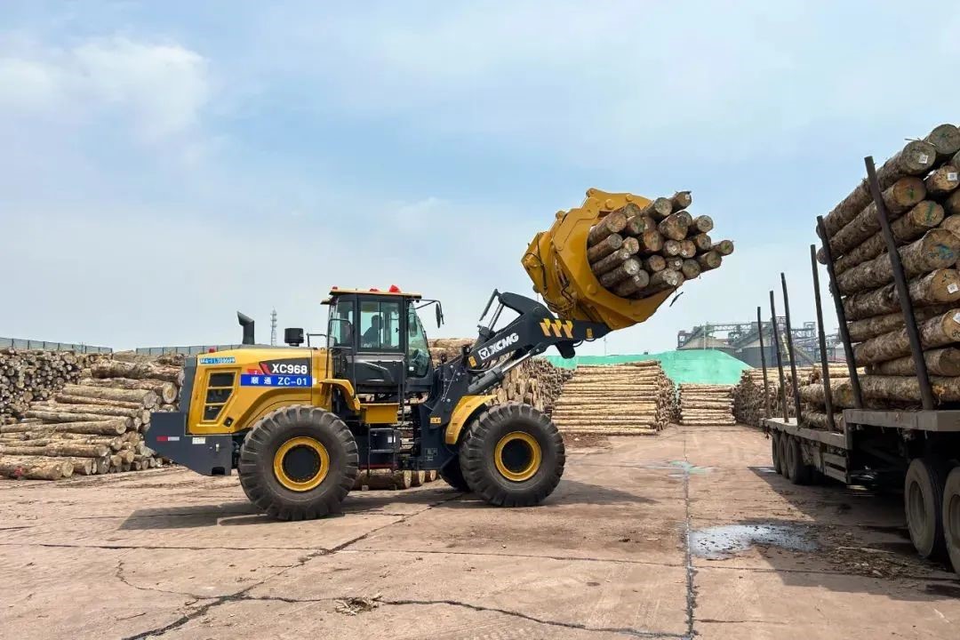 随着满载原木的货轮缓缓靠岸,日照港瞬间切换为一派繁忙景象,20台徐工XC968I夹钳机迅速启动、排列有序登上甲板,将原木从入港船舶上夹起、转运至等待装运的卡车,动作一气呵成。