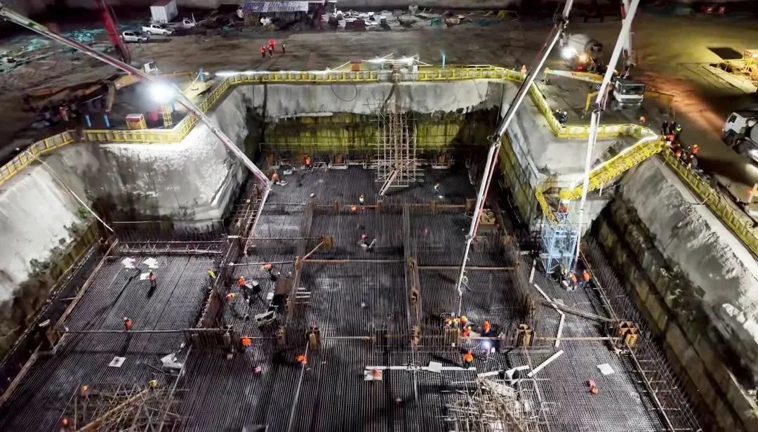 施工现场,三台徐工大米数泵车臂架齐伸、昼夜不休,48小时完成9300立方米浇筑量,高效、稳定、精准地完成泵送任务,助力项目实现重要节点目标。