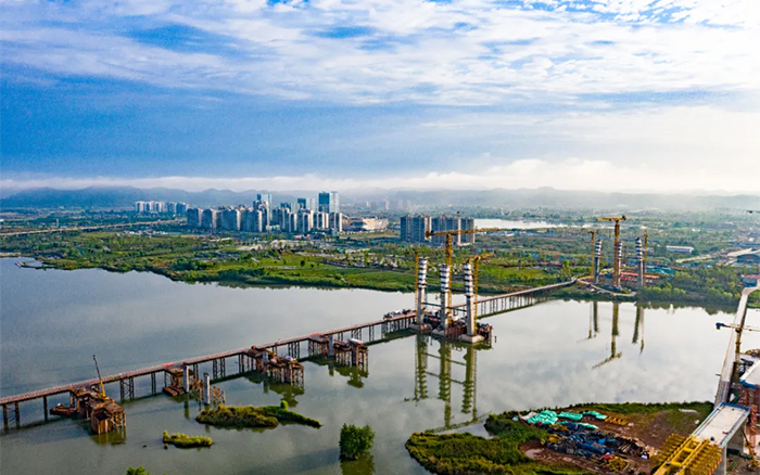 涪江六桥是遂宁首座斜拉桥,主桥为双塔斜拉桥,项目总投资约19亿元,路线全长3215千米,主墩最高118米,是全国首座无筋钢壳混凝土组合柔性索塔。项目计划于2025年10月建成,建成后将成为遂宁的标志性建筑,现已进入桥梁主墩索塔施工阶段。