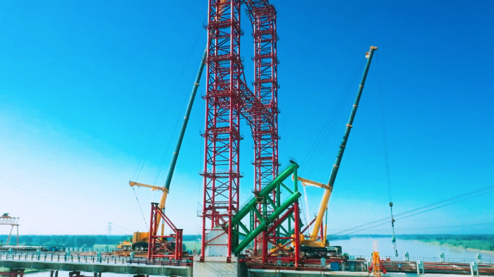该黄河特大桥是目前国内规模最大的下承式钢管混凝土系杆拱桥,作为架起拱桥主拱圈“骨架”——拱肋的主力,徐工起重机是如何架起“彩虹”的呢?