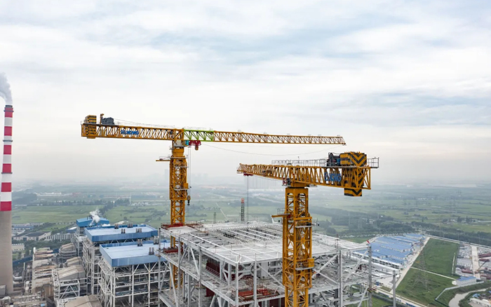 侧望长江畔,机器轰鸣、江水潺潺,华能太仓电厂机组扩建项目施工现场一派繁忙景象,XGT3100-160S、XGT1350-64S两台徐工超大塔稳稳矗立在高耸的钢架间吊装作业。
