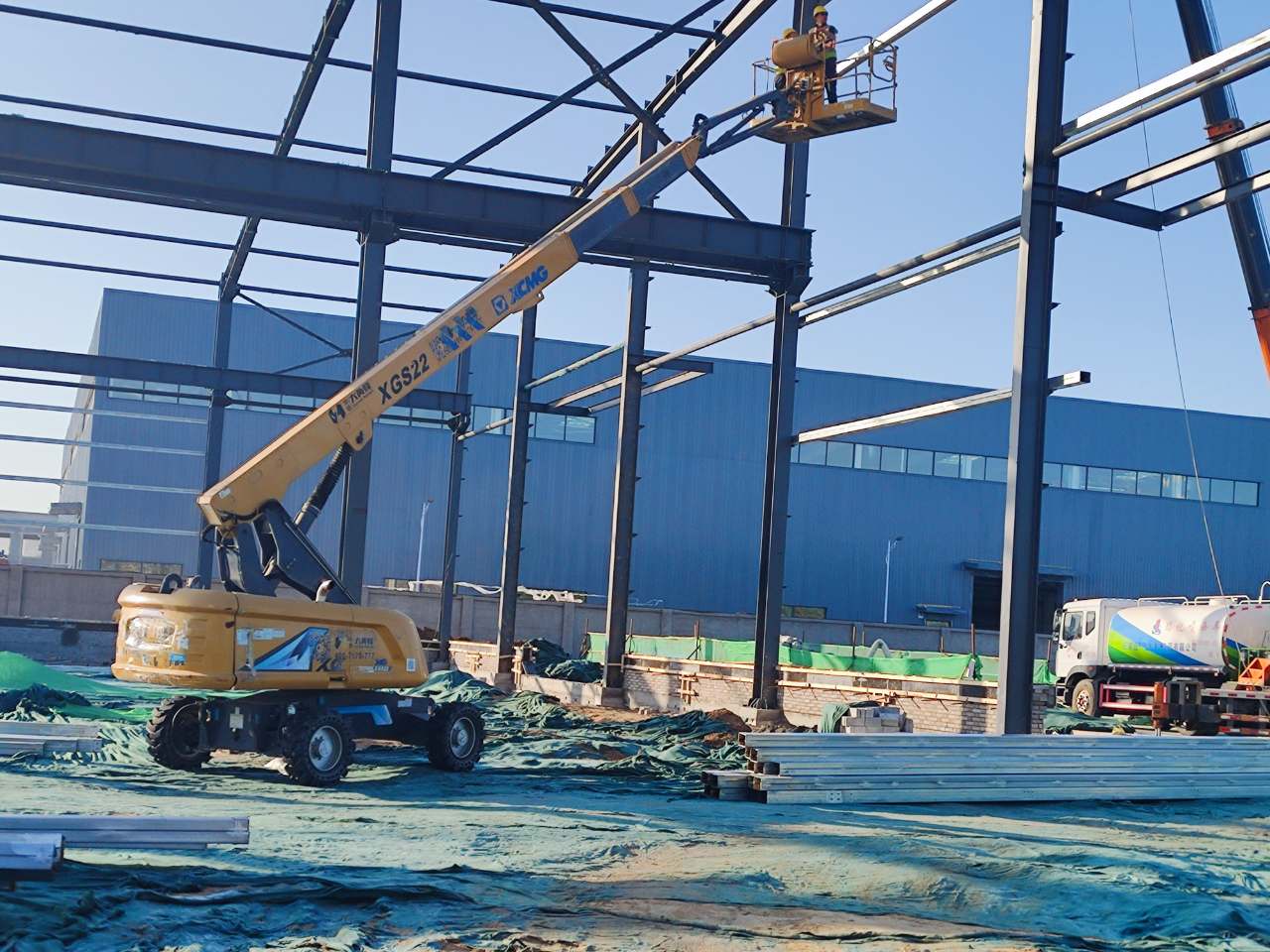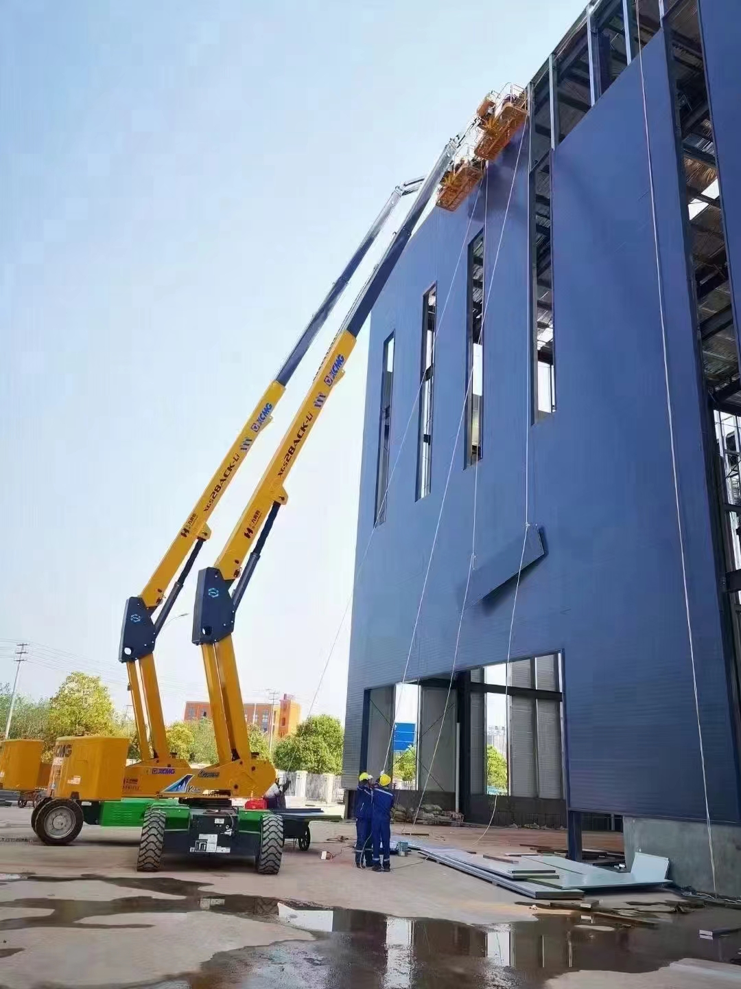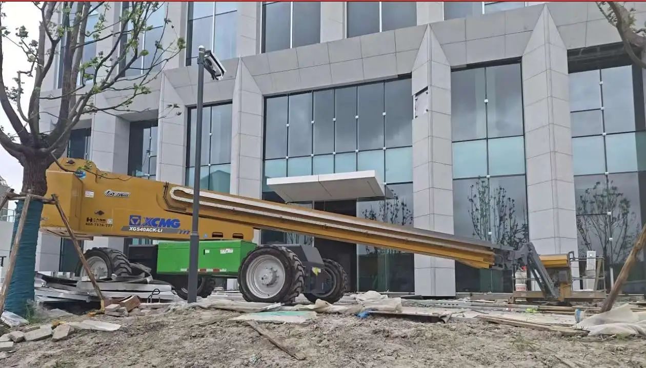 徐工两台XGS28ACK-Li正在紧锣密鼓的进行外立面的安装工作,凭借其具有自平衡功能的伸展机构以及大容量的锂电池,既保证了施工的安全,又提高了工作效率,获得了施工方的一致好评。