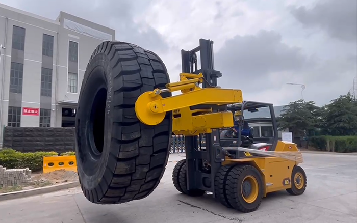 近日,在山东地区某大型轮胎厂内,徐工孔雀系列高压重载锂电 8 吨叉车,灵活适配属具轮胎夹,正在高效进行轮胎搬运作业,助力客户达成生产目标。