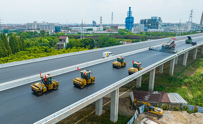 常泰长江大桥大宽度整幅面层的“一键铺平”,也备受瞩目。进行此次摊铺工作的是徐工自主研发的大米数摊铺机和13吨双钢轮压路机,摊铺宽度15m,厚度4cm,属于大宽度的整幅面层摊铺,实现施工效率、桥面平整度双提升。铺装工程涵盖了桥面、主路、匝道等多个施工场景,充分体现出徐工设备的广泛适用性和灵活性。无论是宽阔的主桥面,还是复杂的匝道区域,都能实现高质量的整幅面层摊铺。