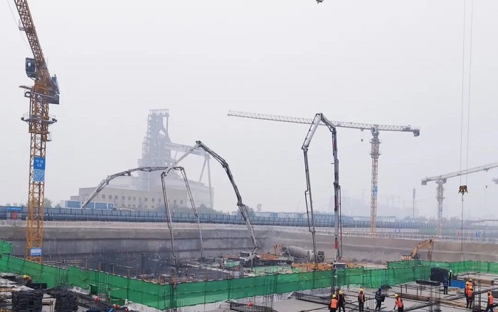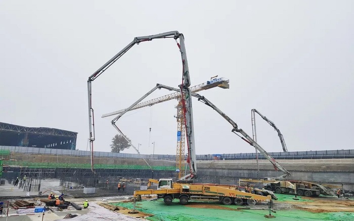 徐工大米数泵车在此次施工中的表现令人瞩目。6节臂臂架灵活伸展,精准定位,浇灌均匀且高效。匹配大马力发动机,泵送效率提升27%,大大缩短施工周期,为项目快速推进提供了有力保障。