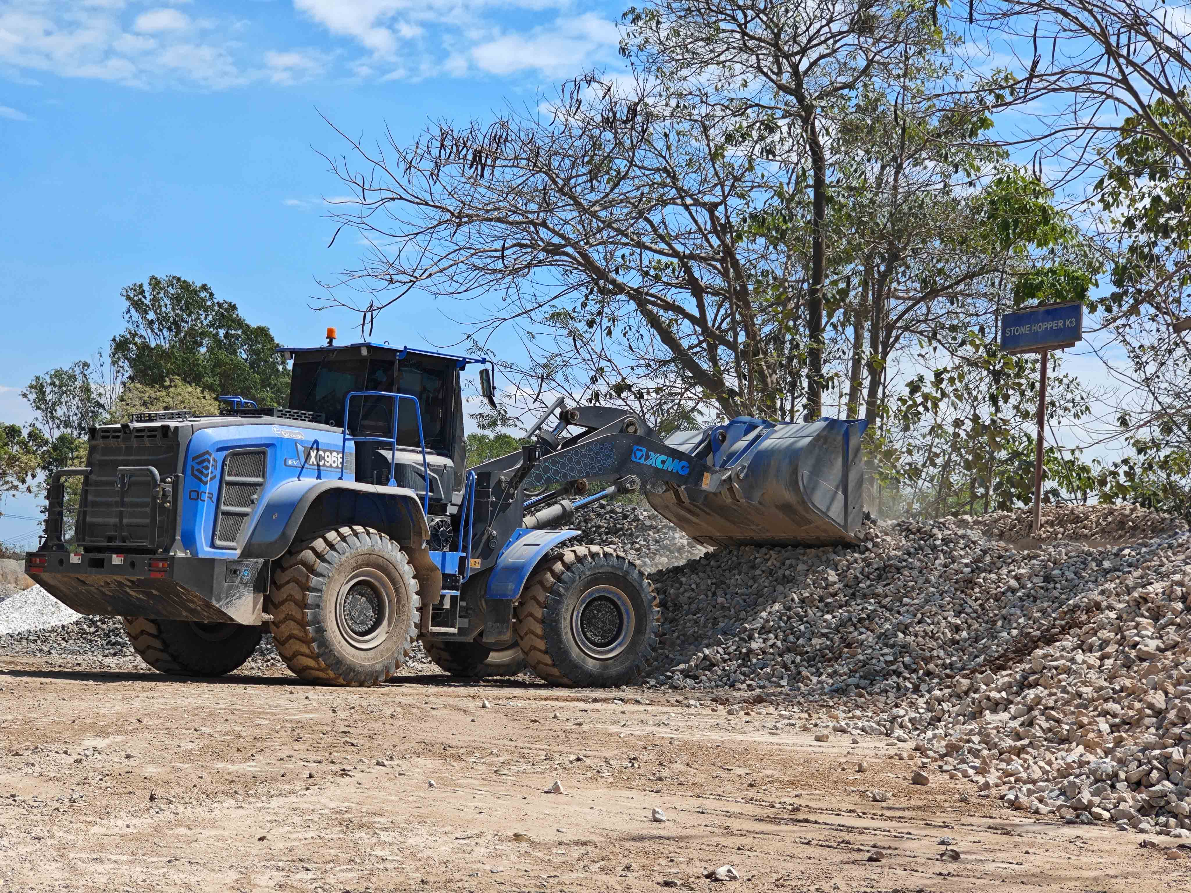 矿山生产,作业时间长,物料坚硬密度高,道路崎岖,工况较为险重。徐工XC968-EV纯电动装载机的新能源优势,在矿道端的铲装作业优势非常明显,相对密闭空间内,零排放、低噪音对工段一起作业的户外工作人员的健康非常友好。