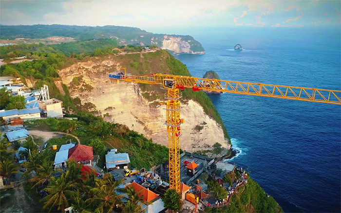碧蓝海湾、洁白沙滩,在旅游胜地印尼巴厘岛,徐工XGT360-20S1屹立在悬崖峭壁之上,眺望悬崖海景和奇特的海岸线景观,为巴厘岛佩尼达精灵海滩观光电梯项目注入徐工“动力”。