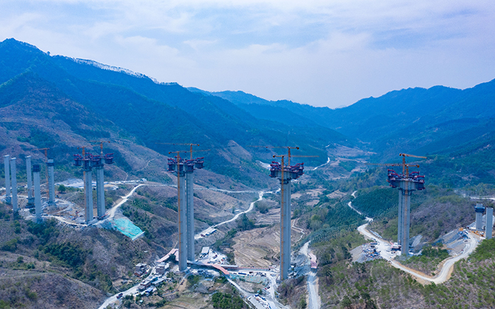 苍翠延绵的群山深处,一根根百米高墩拔地而起,自东向西整齐排列,二十余台徐工S1系列塔机、施工升降机与青山比肩,正有条不紊地吊装,助力雅长特大桥建设加速。