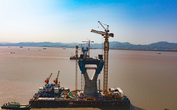 初夏时节,东海之畔,徐工XGT7300-260S、XGT8300-320S挥舞铁臂,如“定海神针”矗立深蓝,助力舟山六横大桥二期工程青龙门大桥主塔施工,“海上巨龙”稳扎稳打向上攀升。