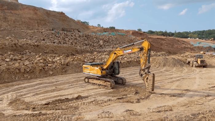 站前区堆积的大体积岩体,正被徐工XE380GK的破碎锤系统转化为可再生建材。