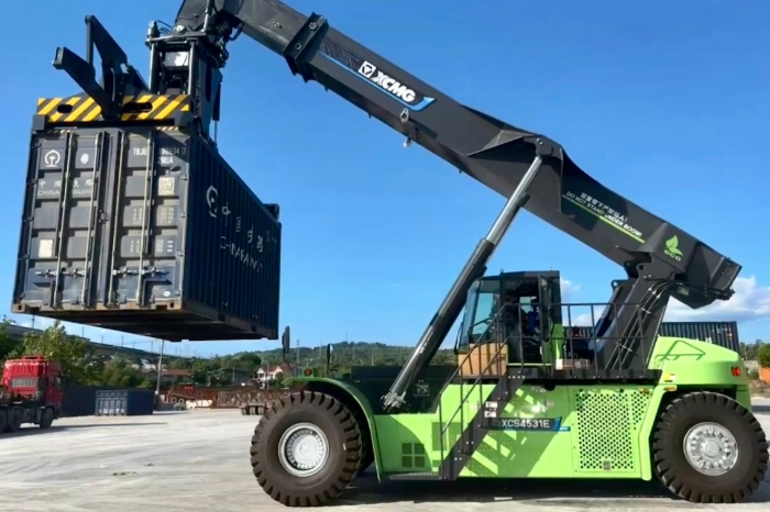 徐工E5系列电动正面吊针对重载工况强化结构设计,整车稳定性升级,重载作业更从容;采用“箱到即运”作业模式,实现货物装卸运输全程不落地,有效减少货物扬尘污染。