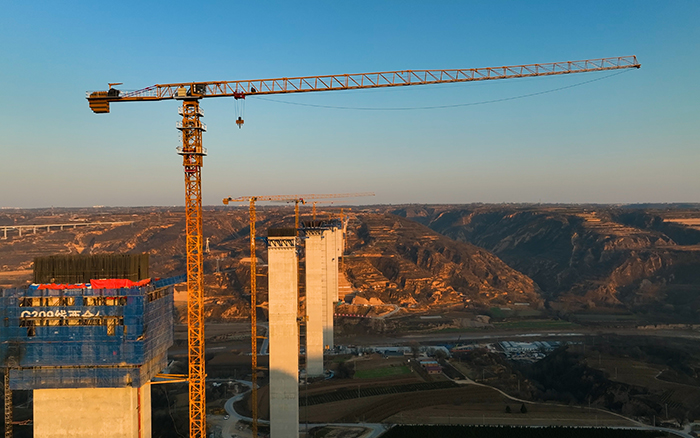 在广袤的陇东地区,穿过层层大雾,俯瞰马莲河特大桥项目,徐工群塔似根根“擎天柱”矗立在黄土高原上。