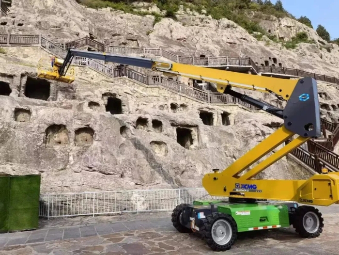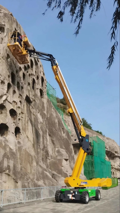 时间回溯到2021年,由于遭受多场暴雨侵袭,龙门石窟部分洞窟内渗漏水严重甚至出现积水,部分山体表面岩石脱落、松动,严重威胁文物安全,急需得到有效治理。龙门石窟研究院随即开展了为期1年多的“龙门石窟莲花洞至石牛溪区域保养维护项目”。徐工XGS25ACK-Li直臂式高空作业平台作为“得力助手”,深度参与各项保护修复工作。