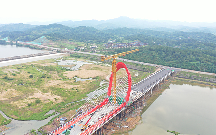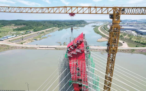 在大别山腹地、金寨县史河河畔,“红色摇篮”傲视远方,徐工XGT2230-100S塔机挥舞着巨臂,随着重达40吨的主桥钢塔柱最后一个节段起吊安装到位,金寨史河大桥主塔顺利合龙。