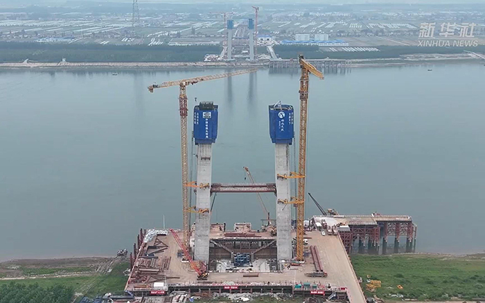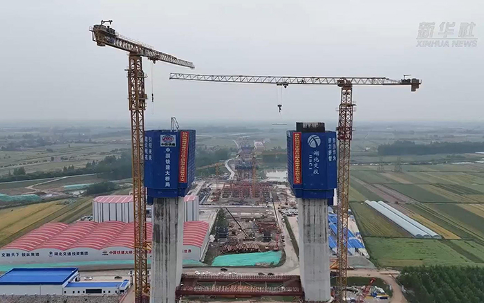 初秋时节,长江之畔,两台徐工XGT600A-25S塔机铁臂挥舞,助力荆州李埠长江公铁大桥南岸主塔下游侧第18节塔柱顺利完成浇筑。