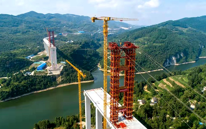 承担大桥缆索吊系统架设的是徐工S系列塔式起重机主力机型--XGT7022-10S。在大桥拱肋首节段吊装过程中,“徐工金”凭借“精、准、稳”,为大桥的高质量、高安全、高效率的施工提供了有力保障,为德余高速公路建设按下“快进键”。