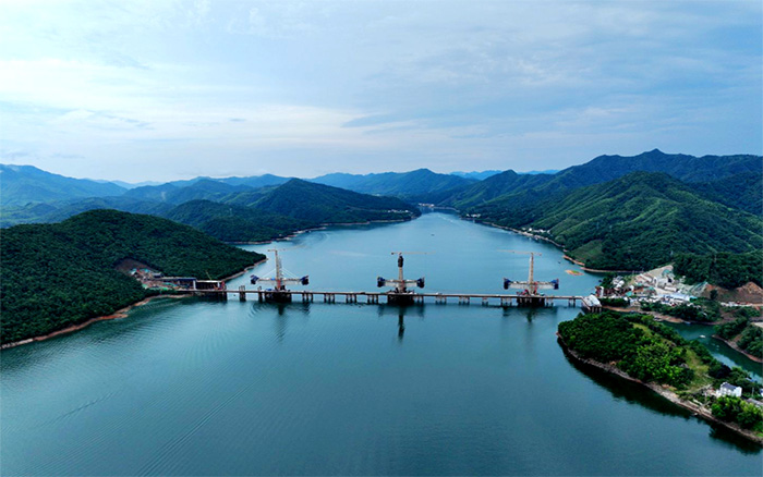 太平湖特大桥作为池黄高铁全线唯一控制性工程,全长926.1米,采用双线三塔矮塔斜拉桥,两个主跨均为228米,是目前国内跨度最大的高速铁路多塔矮塔斜拉桥。