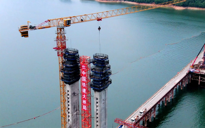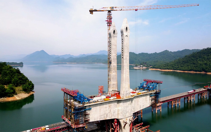 据项目人员介绍:桥面以上塔高47.23米,每个桥塔设置9对斜拉索,共有箱梁161节段,最大节段梁高12米……从吊装到建造桥塔主体全方位考虑,选择稳定高效,智能精准的设备尤为重要。
