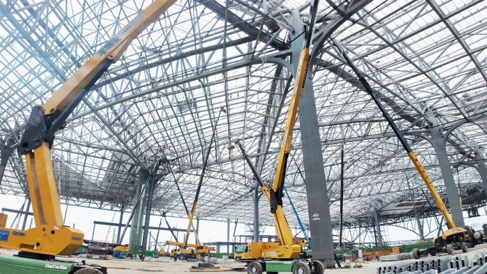 西安东站建设工地上,徐工高空作业平台组成“钢铁军团”正全速推进施工。10余台30-40米直臂车伸展巨臂,精准对接站房屋顶钢结构焊接;12米剪叉车灵活穿梭,高效配合内部砌墙作业。