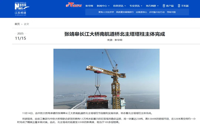 在靖江市马洲岛上空,重达238吨的T29钢塔节段在徐工XGT15000-600S超级塔机的稳定牵引下平稳攀升,精准完成高空对接,整个吊装过程中,塔身始终稳如磐石,为张靖皋长江大桥关键节点的突破提供了坚实支撑。