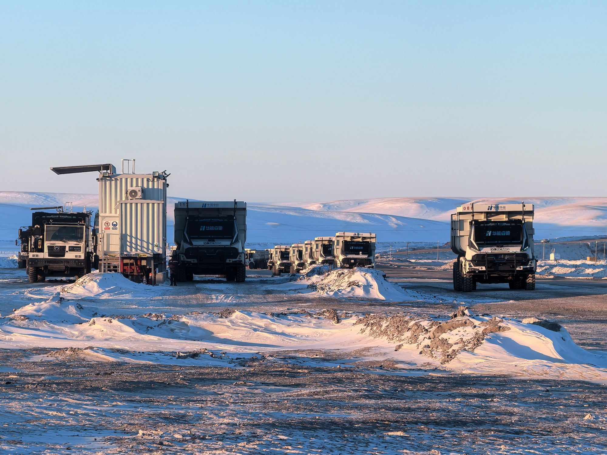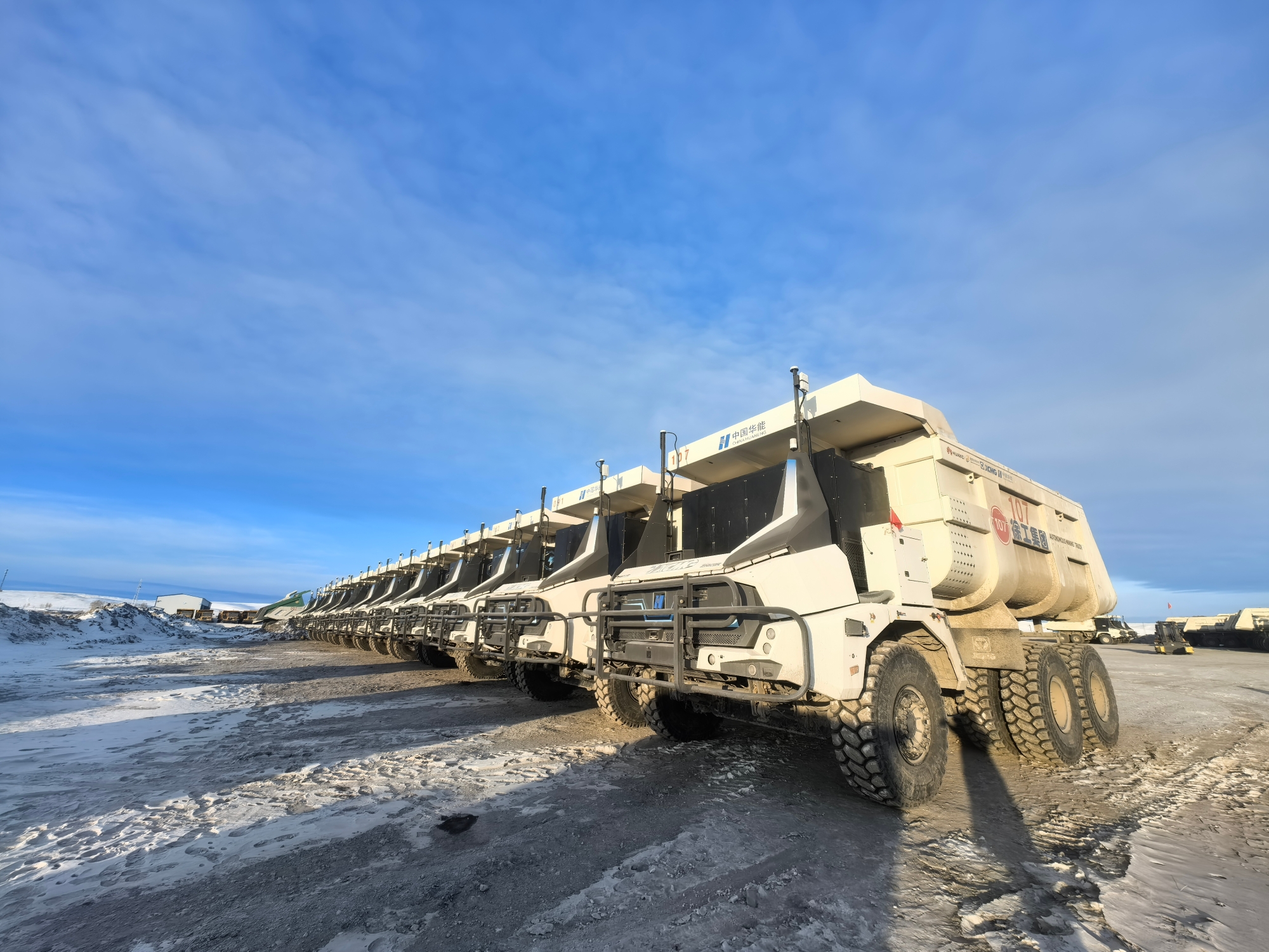 从夏日的绿草如茵到冬日的白雪皑皑,内蒙古华能伊敏露天矿的年均温差超60摄氏度。12月,气温已降至零下30多度,白雪覆盖的矿坑中,百台无人纯电矿卡正以“钢铁洪流”之势穿梭前行。