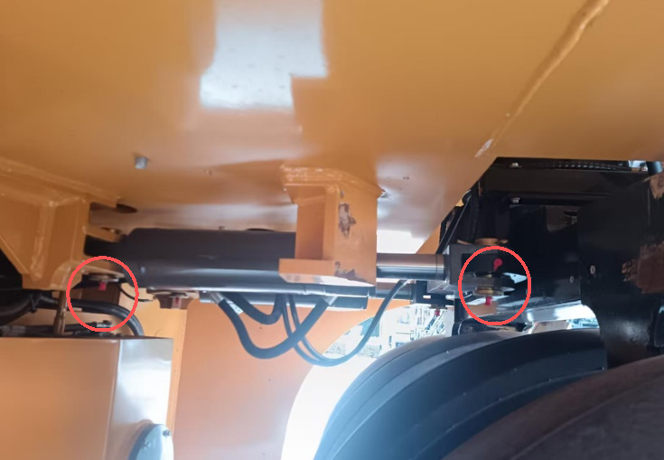 左右转动方向盘,暴露出油杯,擦拭干净油杯周围,通过黄油枪,分别向转向油缸的4个油杯各加注约5个行程(或根据黄油溢出判断加满)的黄油。让少量黄油留在黄油嘴上,以防灰尘进入。当转向油缸出现内外渗漏现象时,应检查并更换油缸密封件。