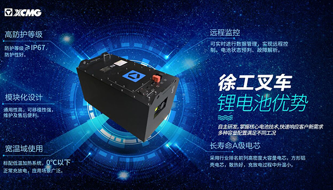徐工叉车掌握核心电池技术,鲲鹏电动叉车搭载自主研发的锂电池,电池模块历经20余项极限安全试验,可在高、低温环境正常作业;大容量电池配合随充随用的锂电池快充特性,使得鲲鹏电动叉车拥有超长续航能力。