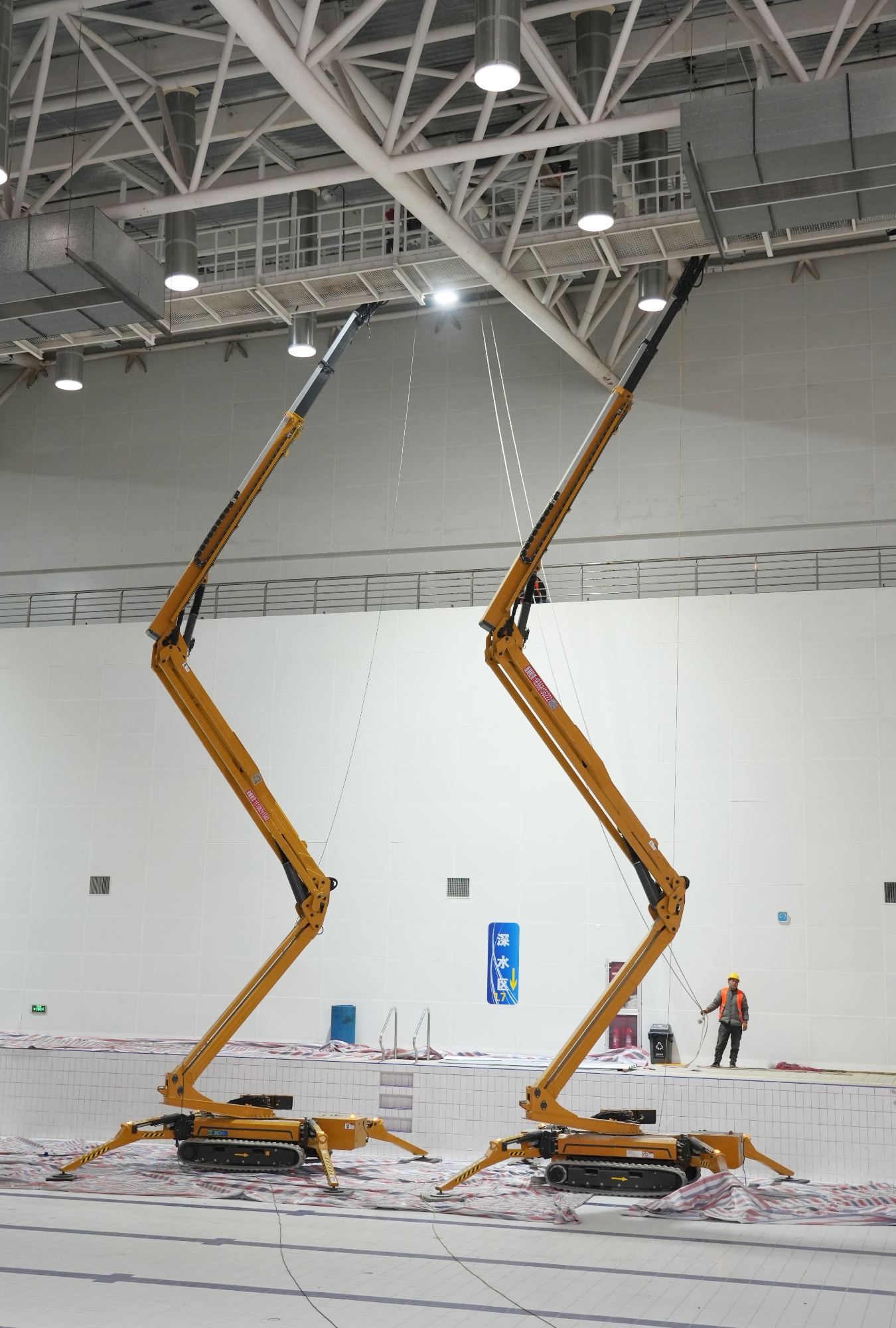 据悉,该项目策划伊始,便遇到两大难题:场地狭窄,入口宽1m高20m,且场馆下方为地下车库,地面承重低,普通臂车无法进场;若采用传统脚手架,需满架搭建,成本高且工期长。面对如此工况,徐工XGA26X-Li蜘蛛车精准破局,成为受限空间施工核心利器。
