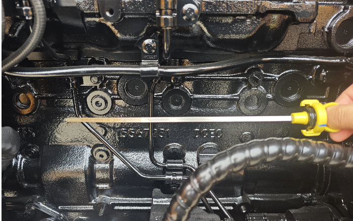 检查机油需关闭发动机静置5分钟以上,设备处于水平位置时测量,确保油面在油标尺“L”与“H”之间,保证测量准确。