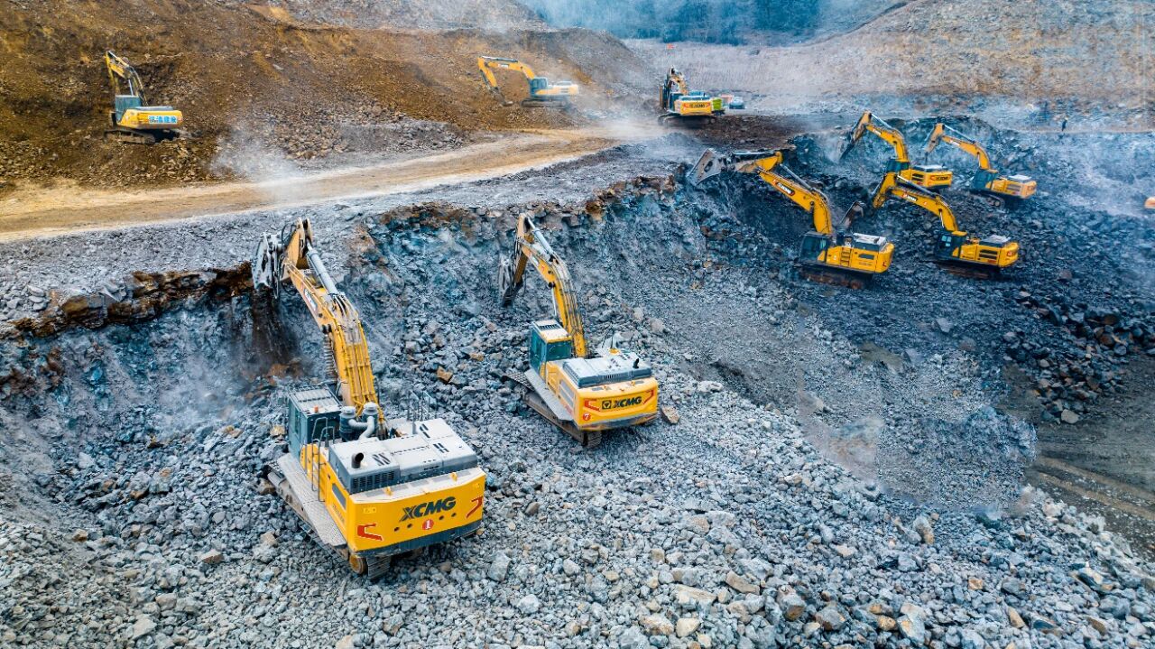 为确保工程顺利推进、抢抓冬季施工黄金期,施工方经过多次研讨优化施工方案,最终选定徐工挖掘机承担本次场平核心任务。目前,现场已陆续进驻14台徐工挖掘机,全面包揽山体玄武岩破碎及土石料装车等关键工序,全力攻坚约300万方的工程总量。据悉,滁州部分施工区域地质条件复杂,多为坚硬玄武岩,对施工设备的效率与可靠性提出极高要求,而徐工XE650GK等明星机型凭借出色性能成为攻坚主力。其中8台XE650GK搭配215破碎锤,依托独有的破碎多级调频控制技术,高效破解高硬度岩石施工难题,每日保底破碎玄武岩1500吨以上,轻料作业日产量可达2000至3000吨,且油耗控制在40L左右,实现高效与节能双赢;徐工380、335等机型则协同开展土石方挖装作业,搭配矿山专用铲斗,以灵活操作、稳定底盘和优异的挖装效率,成为施工现场的“得力干将”。