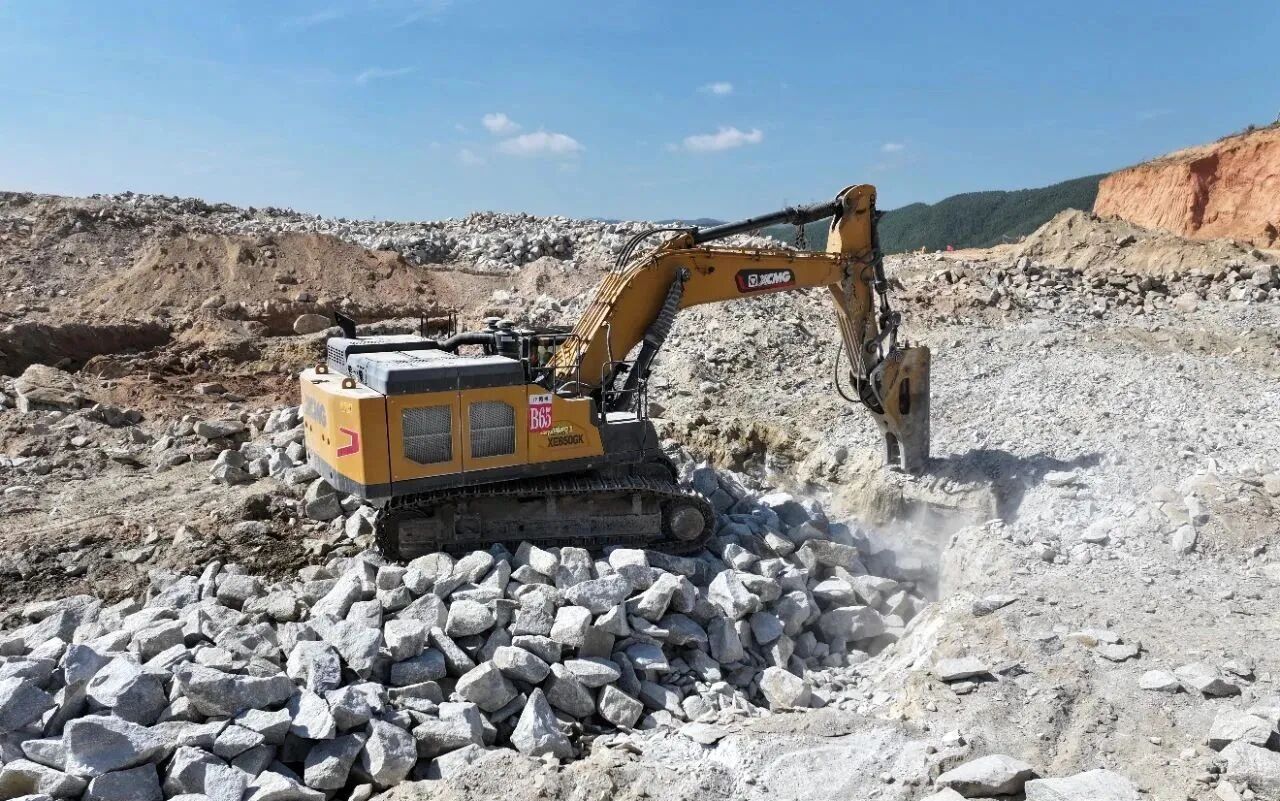 徐工挖掘机的出色表现源于持续迭代升级。荣获2023年“中国工程机械行业TOP50市场表现金奖”的XE650GK挖掘机,采用新一代智能电控系统,整机能效提升7%-10%,是攻坚硬岩的核心力量。客户称赞其“稳重顺手、配重敦实、油耗经济”,40升油的消耗量极具优势。针对复杂工况,徐工精准搭配设备:石方作业选用370、380型号配1.9m³铲斗提升重载效率,土方及清表作业选用200型号兼顾灵活,多型号协同实现月产15万方,确保项目有望超额完成。