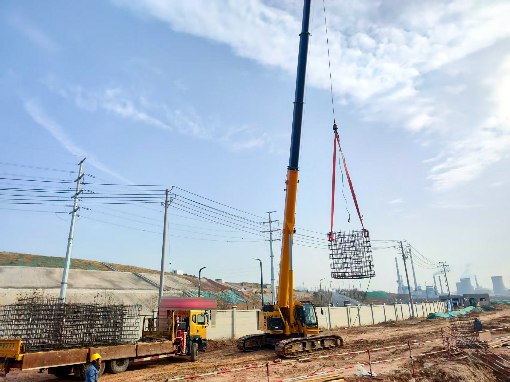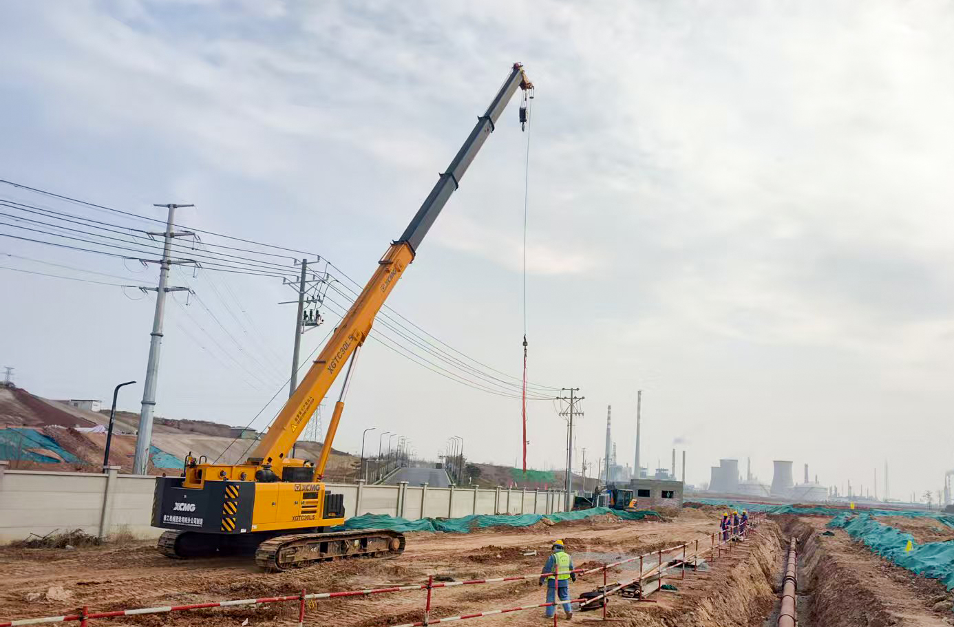 洛阳百万吨聚乙烯项目基础施工现场,XGTC30L5(30吨级)伸缩臂履带起重机正承担着关键工序——钢筋笼吊装。
