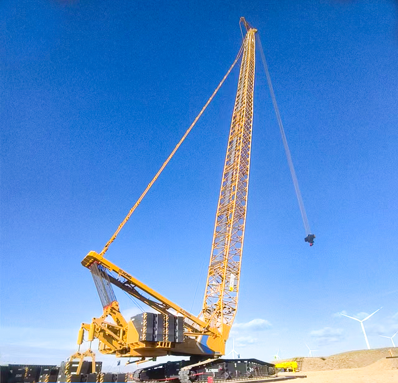 XLC15000采用超起工况,将130吨机舱稳稳送至百米高空,吊钩动态防摆技术悄然发力,重物如被无形的手托稳,毫米级精准对接塔筒法兰,风沙难扰分毫。