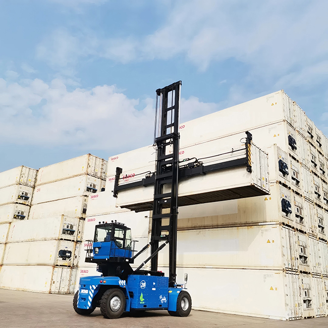 XCH908E换电堆高机可用于集装箱空箱装卸、场地转运及堆垛作业。该客户在选择新能源港机时,第一时间选择了徐工设备,并对此满怀信心道: