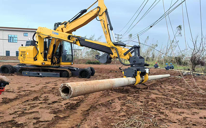 徐工开挖立杆一体机产品一车多能,平均每次新立电杆作业仅耗时20分钟,是砼杆组立施工作业的革新式产品。相较传统作业人力、吊机与挖机配合的方式,更具通用性、高效率和安全性,为本次台风抢险救援行动节省了大量的人力和时间成本,获得施工方的高度认可。