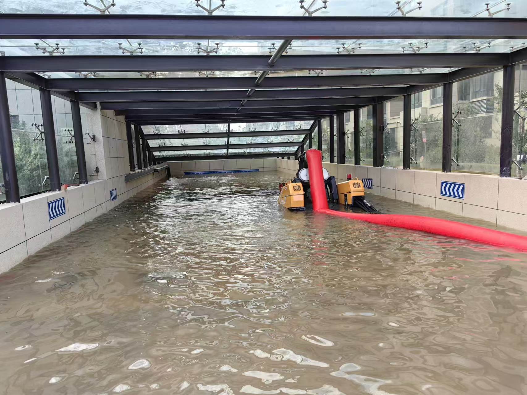 到达现场后,救援队立即开始铺设水带、检查管路,凭借子母式排涝车可实现远程分离控制的功能,救援人员将PS50F停至地下车库入口处,铺设240米超长水带,遥控子车探入斜坡30余米,水泵没入积水进行抽排水。连续工作40小时后,PS50F排除积水超80000m³,内涝隐患得到有效控制,获得现场居民一致点赞。