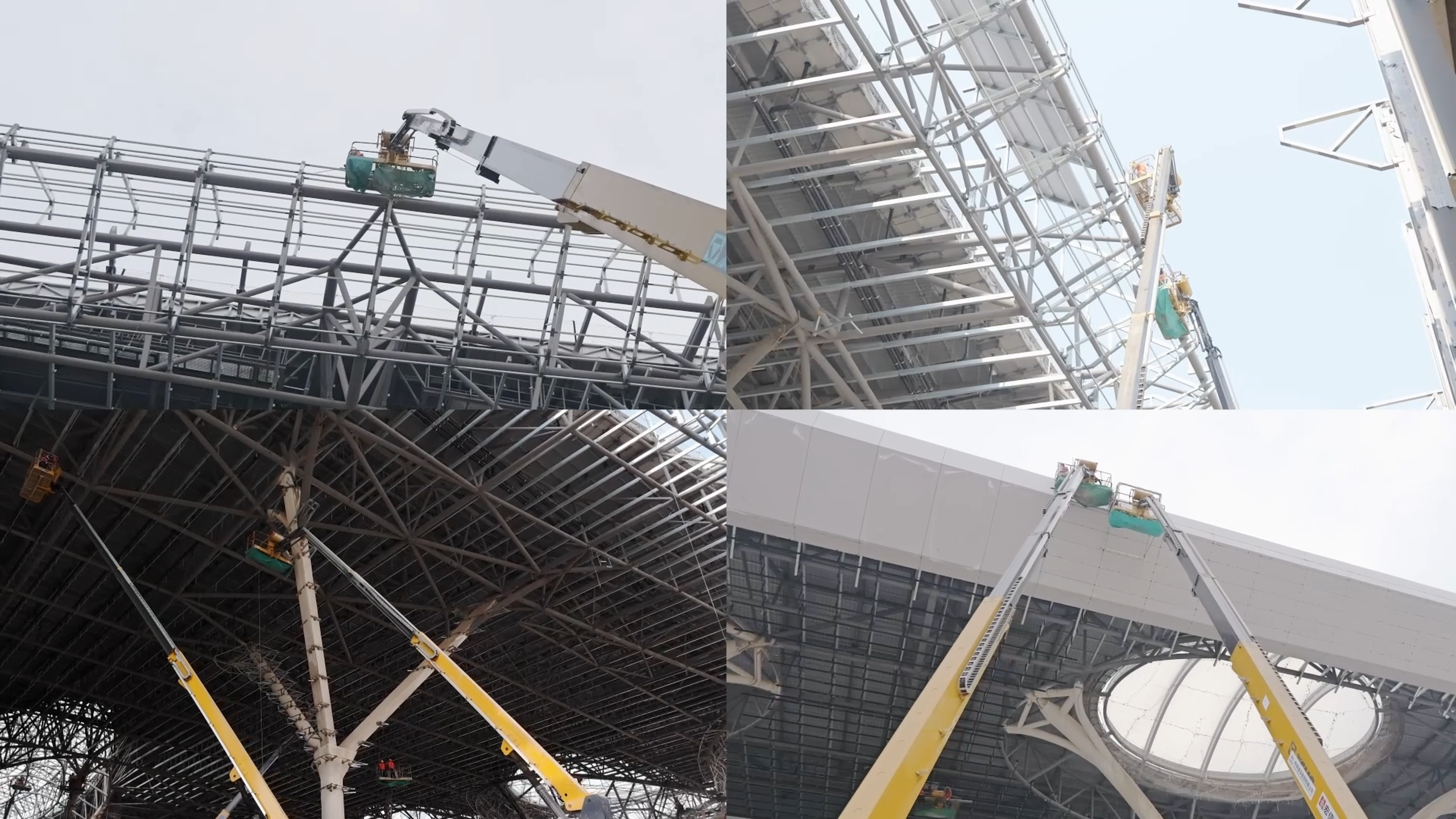 在重庆东站,十数台高空作业平台正在如火如荼的进行钢结构的安装工作,这些高空作业平台作业精准高效,动作平稳灵活,为施工工作节省了大量时间与人力成本。
