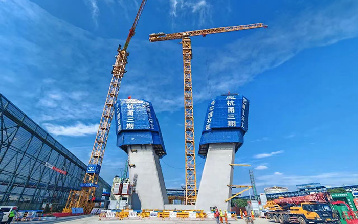 在杭甬复线宁波三期甬江特大桥施工现场,1台徐工XGT3000-120S、2台XGT3000-100S如钢铁巨人伸展手臂,正加紧进行着钢筋部品的吊装,助力3座大桥主塔以平均每天1米的速度向云端挺进,赢得施工方“技术先进、安全可靠、吊装能力强、操作平稳、智能化水平高、施工效益显著”的高度肯定。