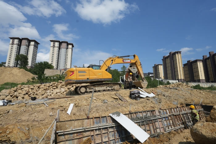 2024年初,近十台身披“徐工金”的XE200GA挖掘机作为项目“开荒者”率先进驻工地,承担起开荒挖装、围挡模具吊装、围挡浇筑等关键基础作业。