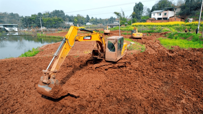 继续向东,这里是万里长江第一城——宜宾,在宜宾江安县阳春镇,5000亩高标准农田建设进入尾声,项目高峰期投入30余台徐工挖掘机。