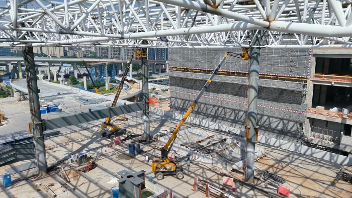以徐工XGS40K为代表的十余台徐工高机有的“一枝独秀”,平稳变幅直指站房屋顶;有的精准定位,灵活探入桁架之间紧贴焊接点,成为保障钢桁架高空焊接作业的主力军,热火朝天的为祖国交通枢纽建设贡献力量。