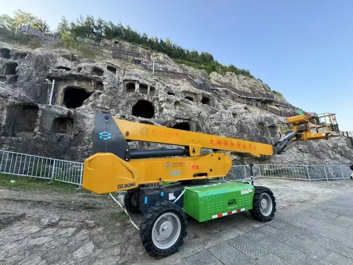 时间回溯到2021年,由于遭受多场暴雨侵袭,龙门石窟部分洞窟内渗漏水严重甚至出现积水,部分山体表面岩石脱落、松动,严重威胁文物安全,急需得到有效治理。龙门石窟研究院随即开展了为期1年多的“龙门石窟莲花洞至石牛溪区域保养维护项目”。徐工XGS25ACK-Li直臂式高空作业平台作为“得力助手”,深度参与各项保护修复工作。