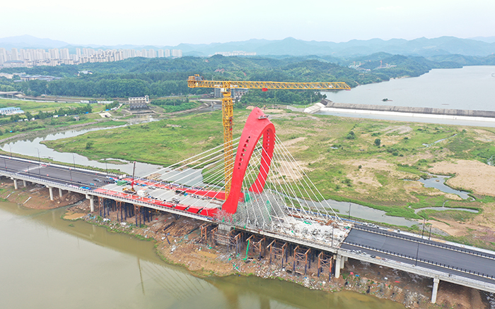 在大别山腹地、金寨县史河河畔,“红色摇篮”傲视远方,徐工XGT2230-100S塔机挥舞着巨臂,随着重达40吨的主桥钢塔柱最后一个节段起吊安装到位,金寨史河大桥主塔顺利合龙。