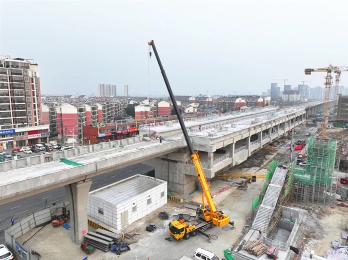 在华中某轨道交通项目现场,徐工G2代XCT50G5-1轮式起重机以40米主臂工况,稳稳将两根长25米、单重1.5吨的轨道板吊运至高架桥基。整个吊装过程精准、平稳、动作流畅,凭借搭载的吊钩防摆技术,大幅简化了操作难度,提升了吊装平稳性与安全性,成为轨道铺设中的关键力量。