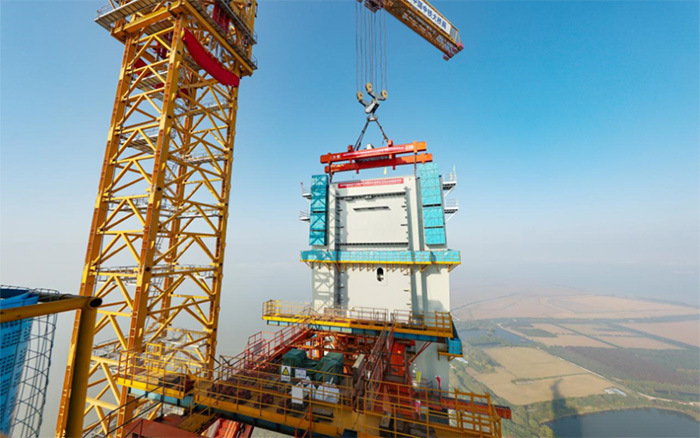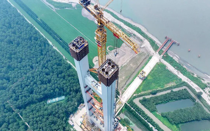 徐工XGT15000-600S采用的创新左右并联式、倒三角截面双臂架结构,有效降低江面风阻,显著增强结构刚性,成功攻克“高空精度、抗风稳性”的施工难题。