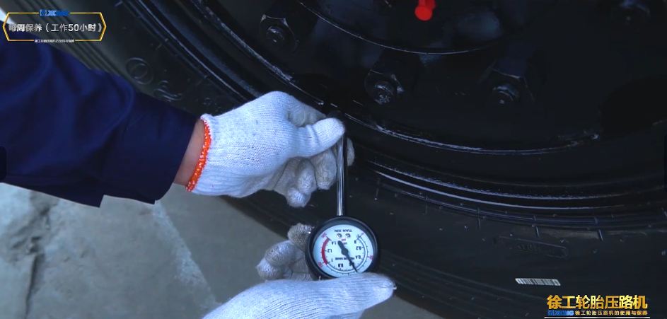 用轮胎气压表检测轮胎气压,轮胎气压正常工作范围为600~650千帕,也可根据施工工艺调整。